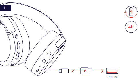 The first step is to charge the headset. This can take up to four hours depending on the initial level of the battery and how it is being charged. The headset can be charged using a free USB port on a computer or by using a wall socket with an adapter, similar to those used for charging smartphones.