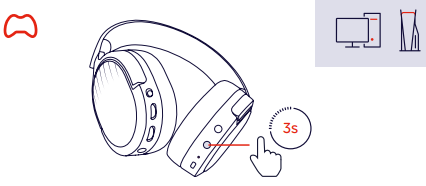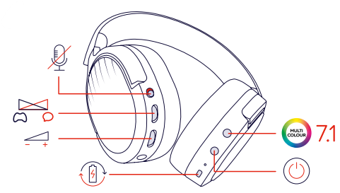 Press and hold the same button for 2 seconds to activate or deactivate the 7.1 virtual sound function. Power button. Press and hold this button for 3 seconds to turn on or off the headset.
